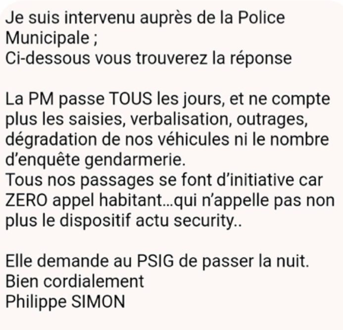 - de plus, les Horaires d'ouverture de la Police Municipale ne correspondent pas du tout aux besoins des Habitants qui sont le soir, très tard la nuit parfois, tous les weeks-end et tous les jours fériés.